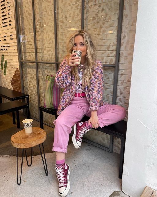 For those who love monochrome dressing with a twist, this pink and burgundy outfit is the perfect balance of soft femininity and casual coolness. The fluffy multicolored tweed cardigan adds texture and contrast against the structured bubblegum pink pants, while the matching hot pink belt ties the look together seamlessly. The burgundy Converse sneakers introduce a relaxed, youthful vibe, proving that fashion doesn’t have to be overly complicated to be stylish. The printed t-shirt tucked into the pants adds an effortless touch, making this outfit ideal for casual coffee dates, weekend brunches, or city strolls.