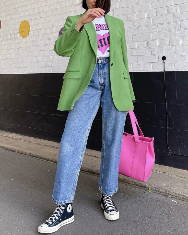 This look redefines power dressing by combining structured tailoring with playful color blocking. The oversized apple-green blazer brings a fresh, modern take on a classic silhouette, making it the statement piece of the outfit. Paired with light-wash denim jeans and a graphic tee, it strikes a perfect balance between structured and relaxed fashion. A bold fuchsia tote bag injects another pop of color, creating a visually striking yet effortlessly wearable ensemble. The black Converse sneakers ground the look, making it a casual yet put-together outfit that’s perfect for everyday wear.
