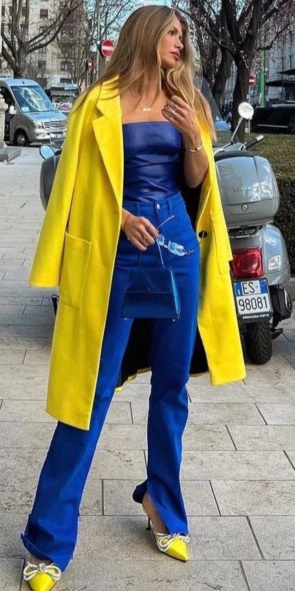 This outfit is a masterclass in color contrast, pairing a vibrant yellow coat with a royal blue corset top and high-waisted trousers. The bold primary color combination is both eye-catching and stylish, proving that fashion in 2025 is about taking risks with color blocking. The coordinated blue handbag and tinted sunglasses refine the look, while the pointed-toe yellow heels with embellishments add an element of luxury. Perfect for a night out, a stylish event, or just making a bold street-style statement, this outfit embodies confidence and high fashion.
