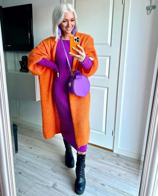 A perfect balance between maximalism and cozy elegance, this outfit embraces unexpected color pairings. The ribbed purple sweater dress acts as the base of the outfit, while the oversized fuzzy orange coat adds a warm and inviting contrast. The matching purple mini bag and chunky earrings keep the look coordinated, while the black lace-up combat boots introduce an edgy contrast, making the ensemble playful yet bold. The combination of textures and vibrant colors makes this a perfect statement look for colder months.