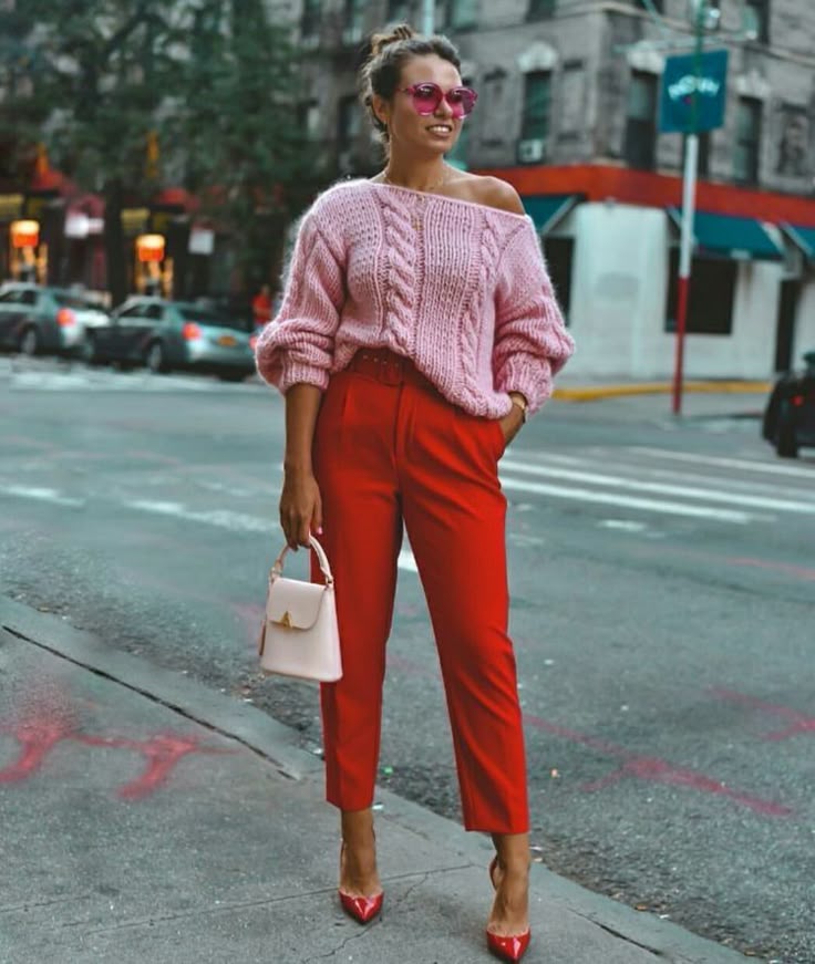 This fun and daring combination of pink and red is a refreshing take on color blocking. The chunky pink knit sweater gives off cozy vibes, while the high-waisted red tailored trousers add a sophisticated touch. The matching red pointed heels keep the monochrome effect within the lower half, while the pastel pink handbag and tinted sunglasses soften the overall look. This outfit is perfect for date nights, cocktail events, or simply making a fashionable statement.