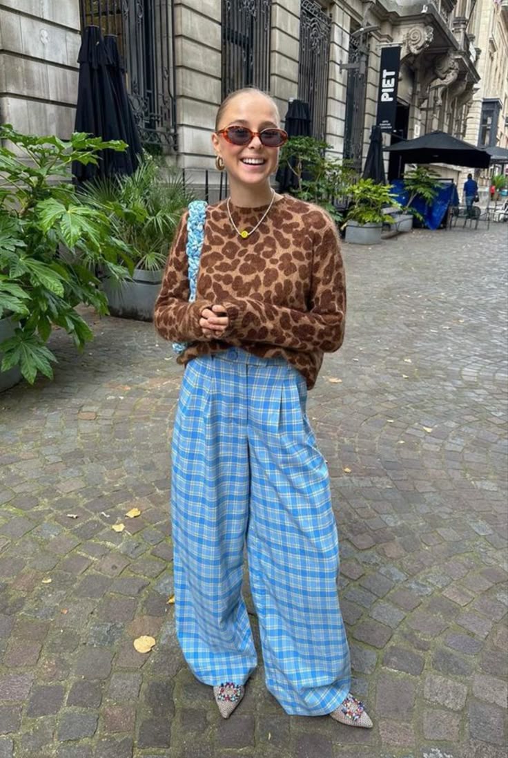 This outfit challenges traditional color rules by pairing a leopard-print sweater with wide-legged blue plaid trousers. The earthy brown tones of the sweater contrast against the cool tones of the pants, proving that mixing patterns can be effortlessly chic. Accessories like small tinted sunglasses and a statement handbag complete the look, making it feel playful yet intentional. This ensemble is ideal for fashion lovers who enjoy mixing vintage aesthetics with contemporary street style.