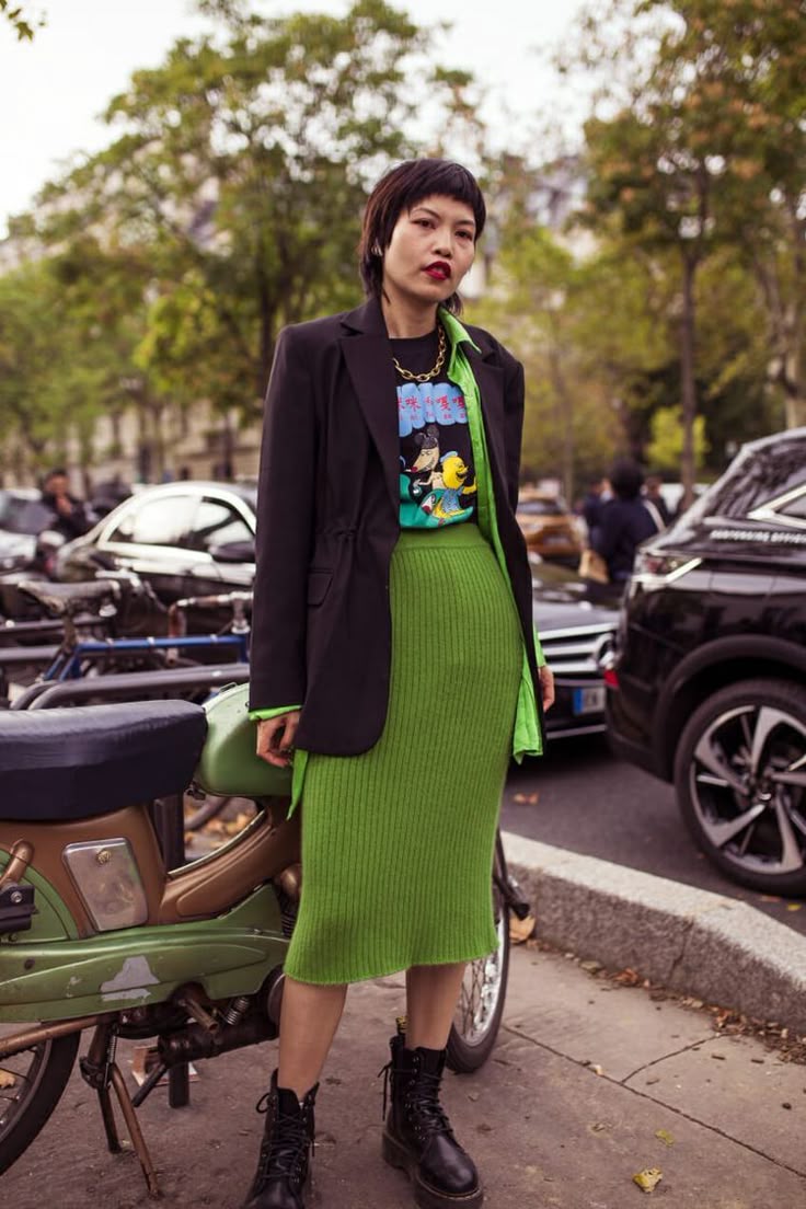 Bringing grunge and sophistication together, this outfit layers an emerald-green ribbed midi skirt with a graphic tee and structured black blazer. The mix of textures—from the ribbed knit to the sleek blazer—creates a dynamic contrast, making this outfit stand out. The chunky lace-up combat boots add a punk-inspired edge, while the gold chain necklace introduces a touch of glam. This look is perfect for street-style enthusiasts who love merging structure with playfulness.