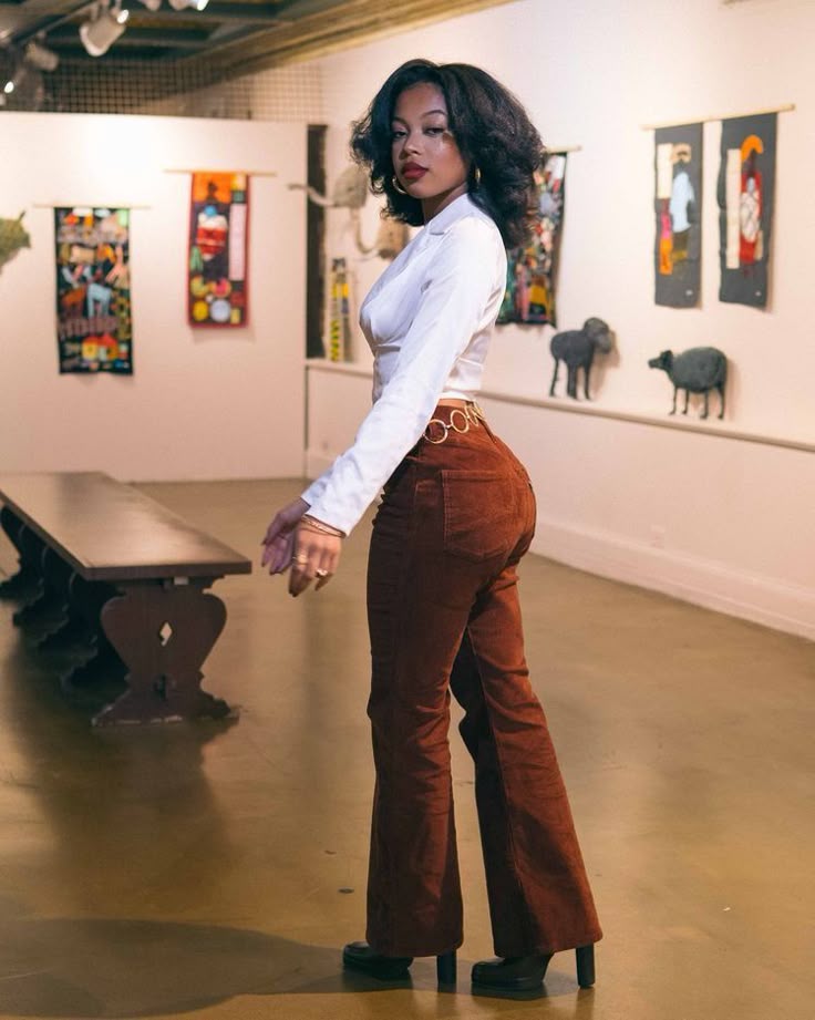 A nod to 70s fashion trends, this chic brown corduroy flared pant and crisp white top combo exudes timeless elegance. The gold hoop earrings and chain belt add a retro flair, making it a stylish outfit for fall and winter 2025. Whether for a night out or a museum visit, this look balances vintage sophistication with modern appeal.