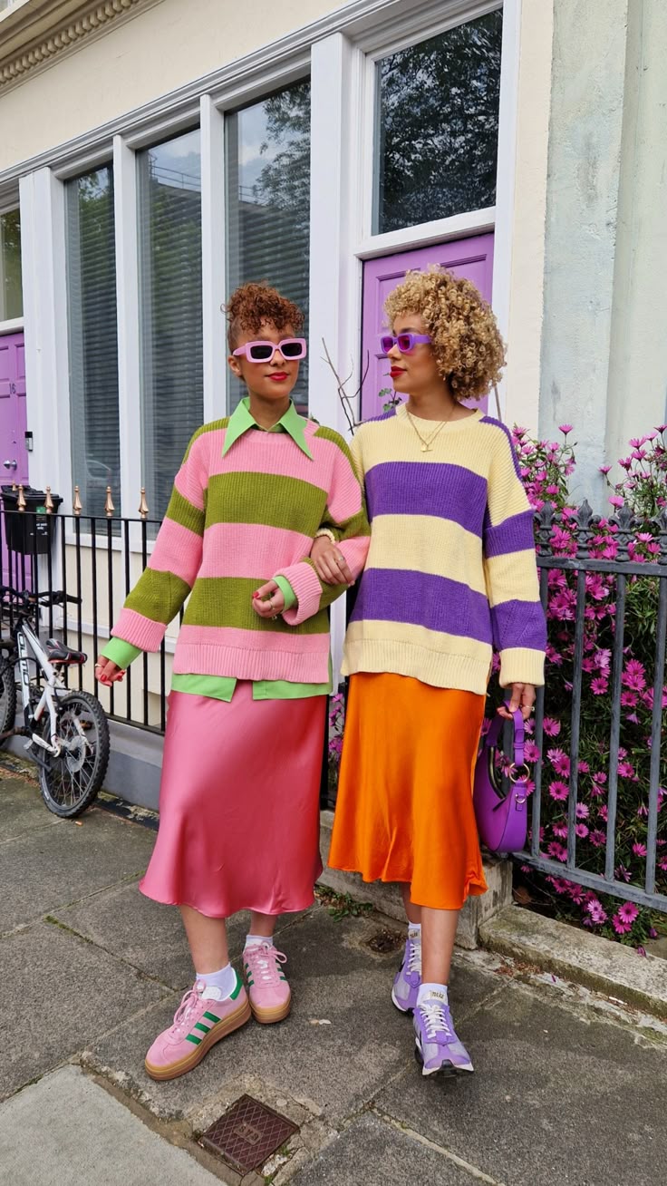 This playful and aesthetically pleasing duo look showcases how to combine pastel and bright tones seamlessly. One outfit features a striped pink-and-green sweater layered over a crisp lime green collared shirt, paired with a silky pink midi skirt for a soft yet vibrant touch. The second outfit keeps things coordinated with a lavender and butter-yellow striped sweater, styled with an orange silk midi skirt, adding an unexpected yet cohesive combination. The choice of retro-style sneakers with green and purple detailing keeps the outfits casual and comfortable, making them perfect for a chic day out in the city. The matching purple accessories, from the handbag to the sunglasses, bring aesthetic summer vibes, proving that color coordination can be both effortless and impactful.