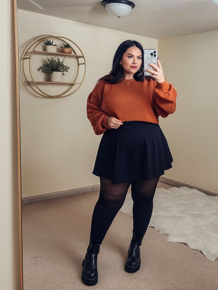Nothing says fall fashion like the rich, earthy warmth of burnt orange and deep black. The oversized sweater creates a cozy and relaxed silhouette, while the flared black mini skirt adds a touch of playful femininity. Sheer black tights add dimension to the outfit while keeping it seasonally appropriate, and the chunky black boots ground the look, making it feel modern and effortlessly stylish. The overall vibe of this outfit is casual yet put-together, making it ideal for autumn coffee dates, weekend strolls, or cozy gatherings with friends.