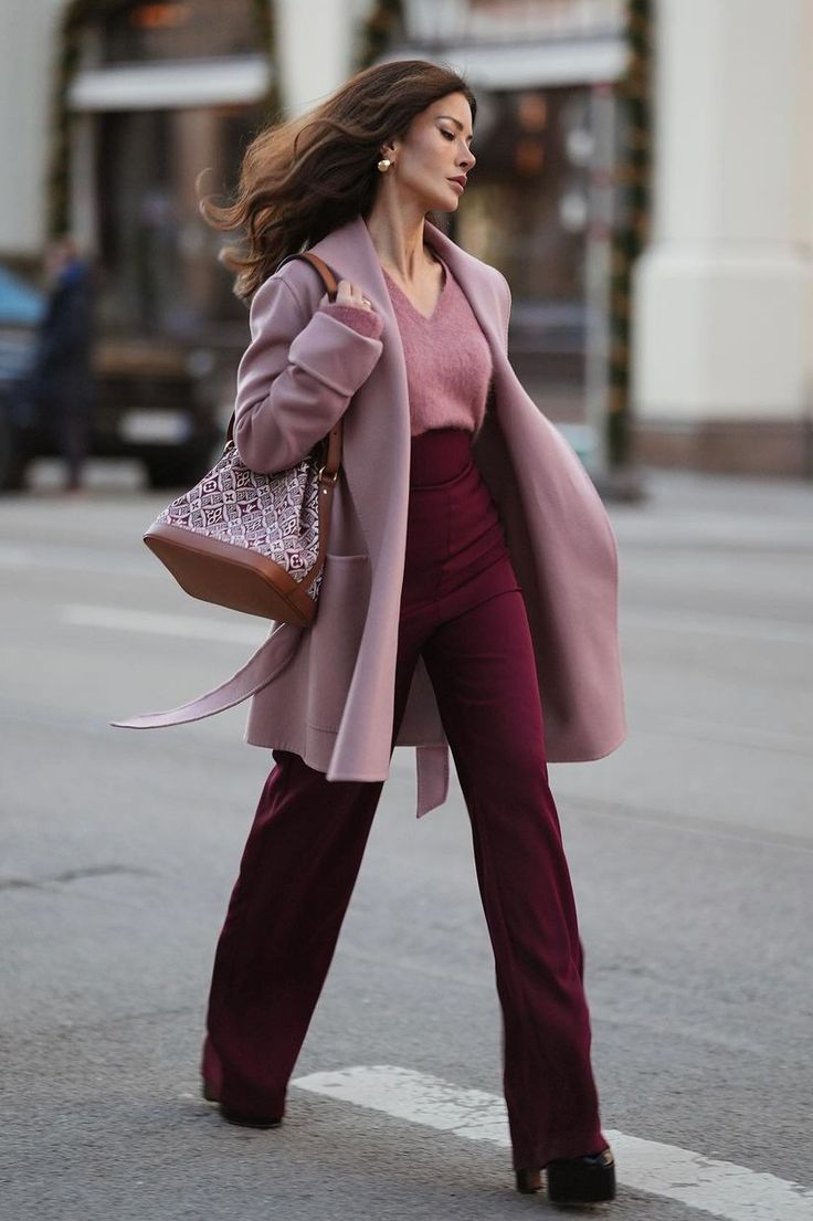 This outfit is the epitome of soft winter glam, featuring a long blush-toned coat draped effortlessly over a dusty pink knit sweater and burgundy trousers. The coat’s structured yet flowy design adds an element of sophistication, making this outfit feel both luxurious and practical. The warm, muted palette makes it a perfect transitional outfit from fall to winter, while the geometric handbag introduces texture and depth. The overall aesthetic is elegant and polished, making it ideal for formal daytime occasions, winter brunches, or even office wear.