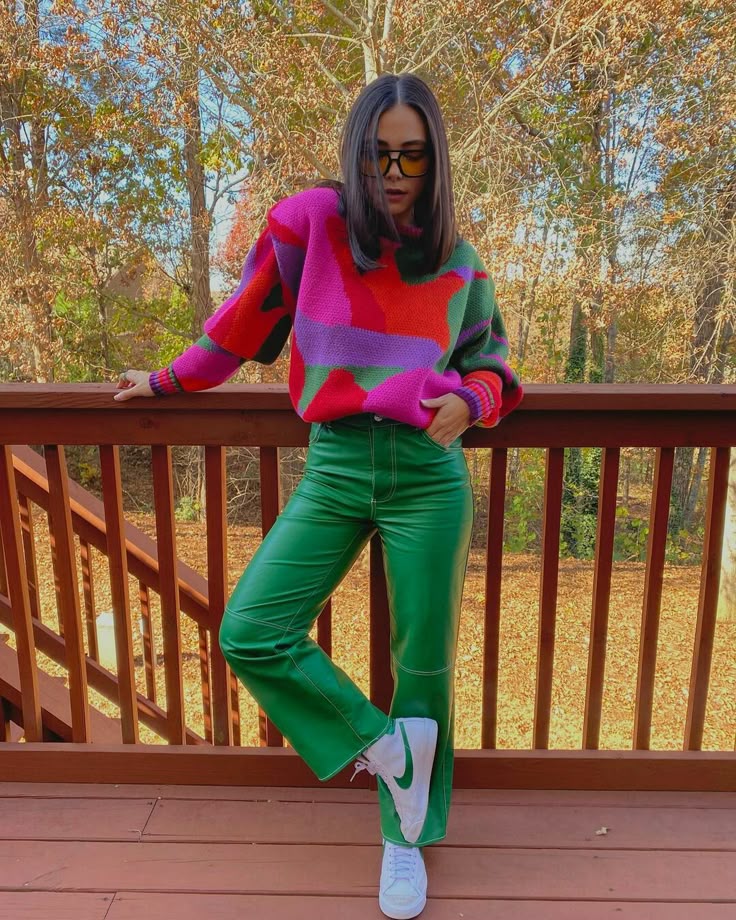A fearless approach to color-blocking, this outfit brings together emerald green leather pants and a bold, multicolored sweater featuring shades of red, purple, and coral pink. The juxtaposition of textures—structured leather against soft knitwear—creates a visually interesting ensemble. Paired with classic white sneakers, this outfit is youthful, fun, and ideal for fall fashion lovers. The oversized sunglasses add a sense of effortless cool, reinforcing the idea that fashion is meant to be expressive and exciting.
