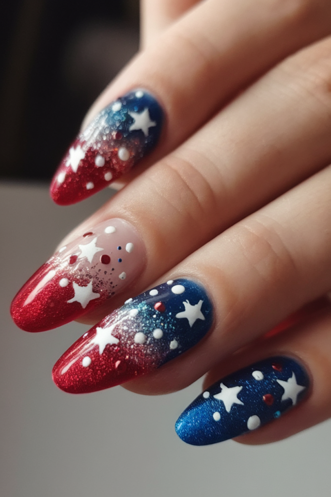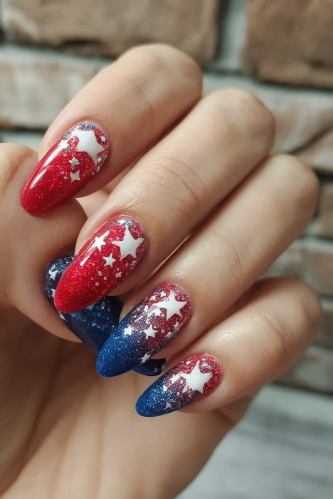 This almond-shaped design is for the glam girls who like their sparkle with a side of freedom. With a dazzling red, white, and blue glitter gradient, each nail is a starry burst of color. The art stands out thanks to white stars layered over a shimmering ombré base, making it ideal for lovers of bold, feminine flair. It’s also an excellent choice for those rocking gel or dip nails, offering long-lasting wear during the long holiday weekend.