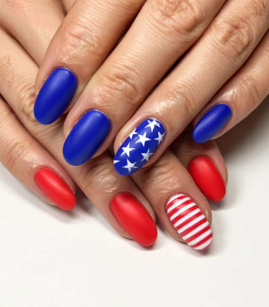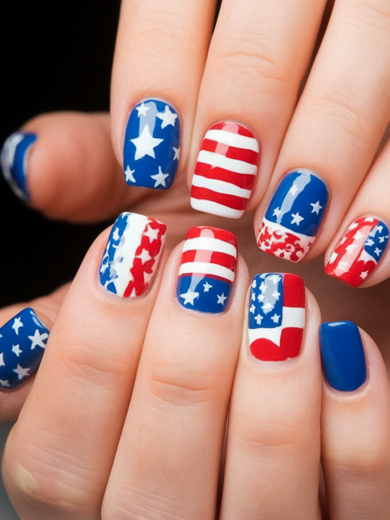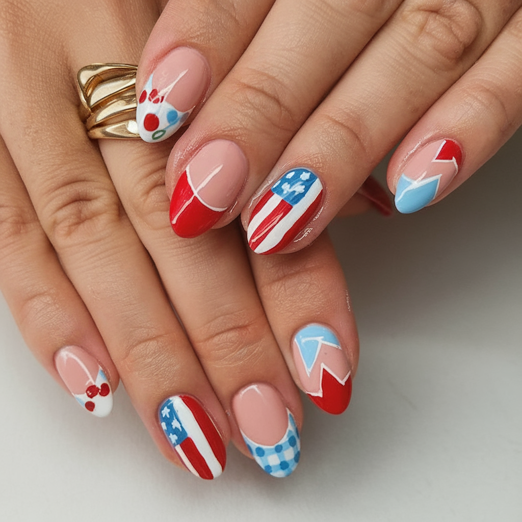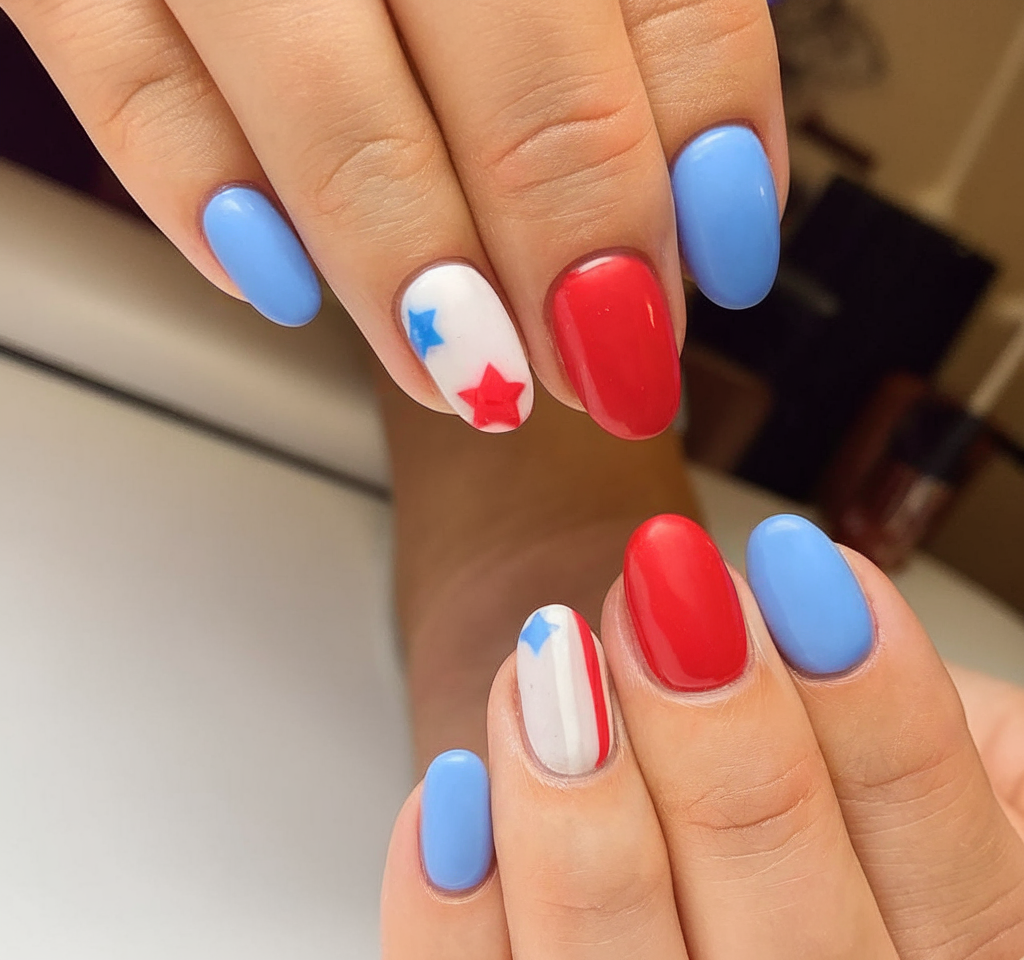 Short, round nails with sharp precision and bright color blocking make this look ideal for women who prefer clean and crisp styles. Mini American flag motifs sit alongside solid red and blue nails for balance, and it’s easily one of the most simple, polished options for busy professionals or moms on the go.