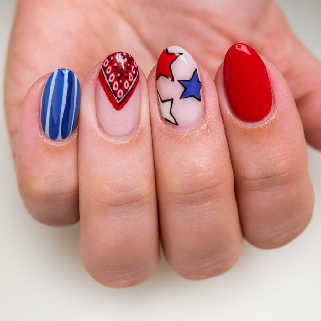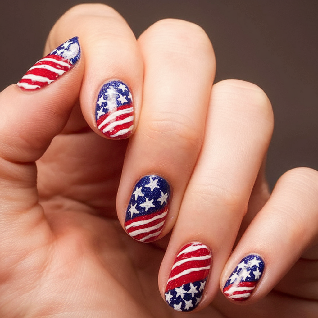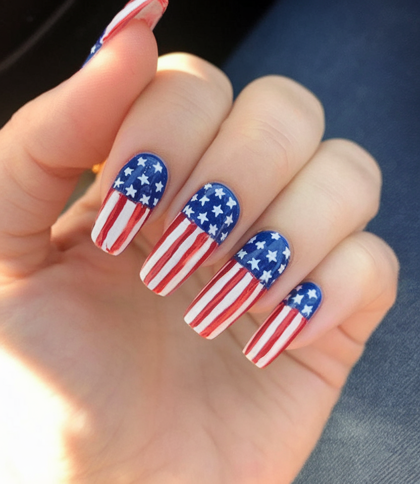 Short, round nails with sharp precision and bright color blocking make this look ideal for women who prefer clean and crisp styles. Mini American flag motifs sit alongside solid red and blue nails for balance, and it’s easily one of the most simple, polished options for busy professionals or moms on the go.