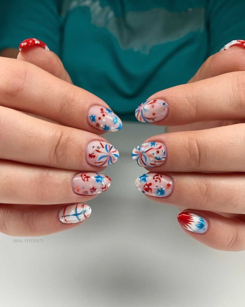 These nails bring the celebration right to your fingertips. Whimsical and full of personality, the nail art mimics bursting fireworks, streamers, and tiny stars—making it perfect for an outdoor bash or family gathering. The round nail shape and natural base keep it wearable, while the details pop in vibrant red, white, and blue. It’s like wearing confetti all weekend long.