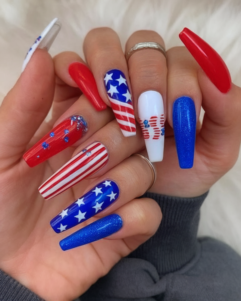 If bold is your thing, this acrylic set is here to make a statement. Each nail is a mini tribute to the American flag—stars, stripes, and glitter galore. The ultra-long nail shape gives off red carpet vibes, while playful accents like rhinestones keep it from feeling too serious. This design was made for women who don’t just celebrate—they shine.