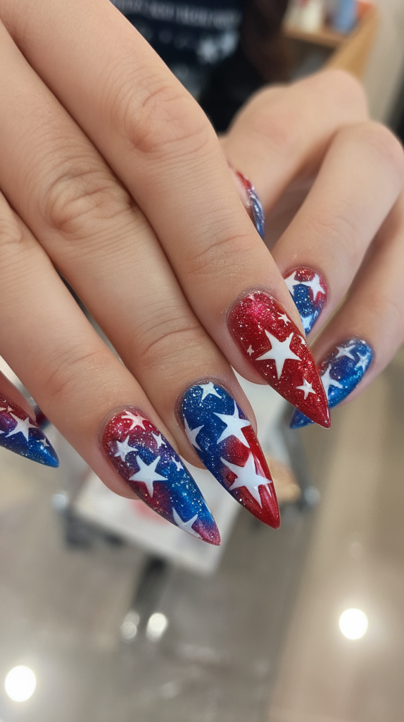 A favorite among trend-watchers, this almond set blends gel nails with a cosmic star design. Deep red and navy swirl with shimmer, while large white stars shoot across each nail like a firework show in motion. It’s a glamorous take on patriotic polish—2025’s version of the classic.