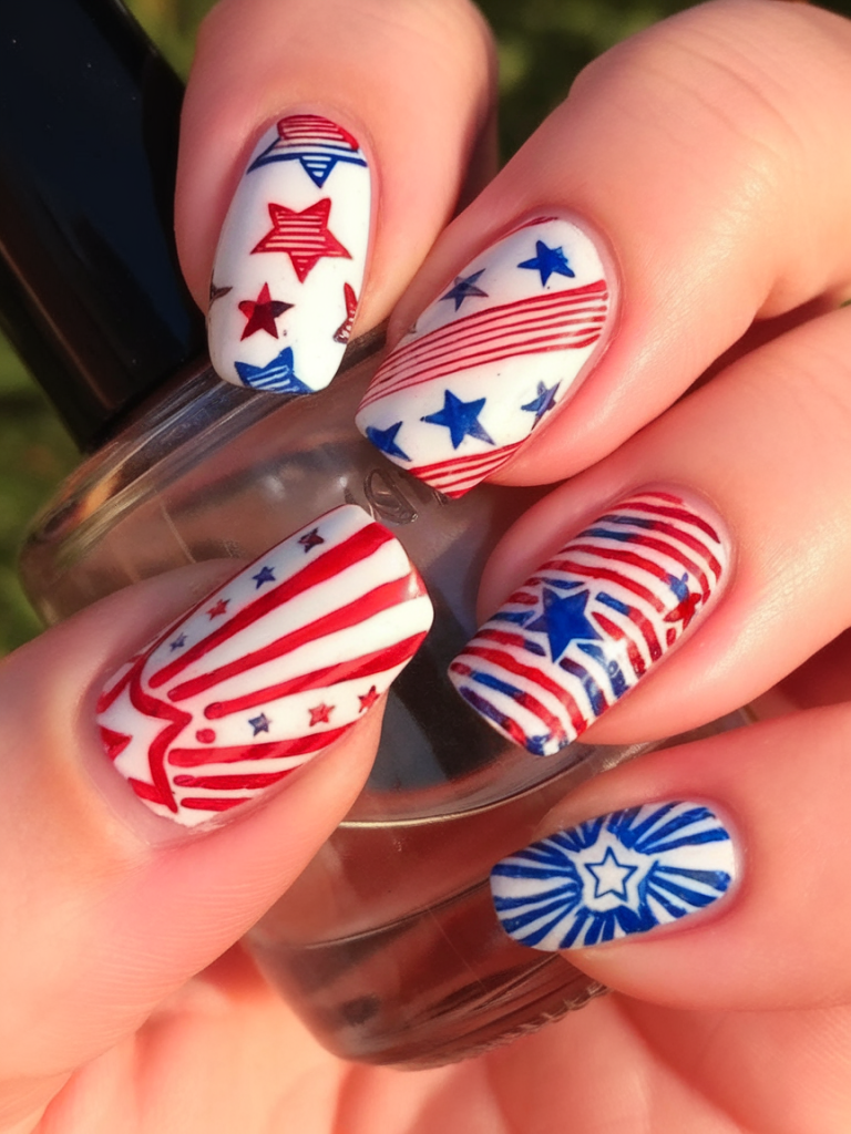 This set is a starburst of art designs done on a creamy white base—perfect for a natural nails look with a twist. Red and blue stars in varying sizes burst from each nail, framed by stripes that give off major firework vibes. It’s cute, graphic, and surprisingly easy to pull off with nail wraps or stamps, making it great for DIY lovers.