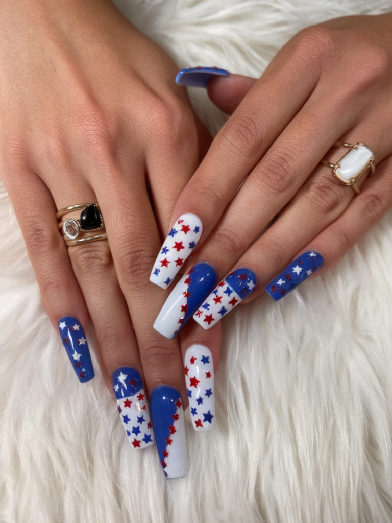 This bold acrylic coffin set is everything you want in a fierce 4th of July look. With red and blue stars scattered over crisp white and deep navy bases, it’s unapologetically patriotic. The long, tapered nail shape makes it a dramatic choice, but the repetition of the star motif keeps things coordinated and visually satisfying.