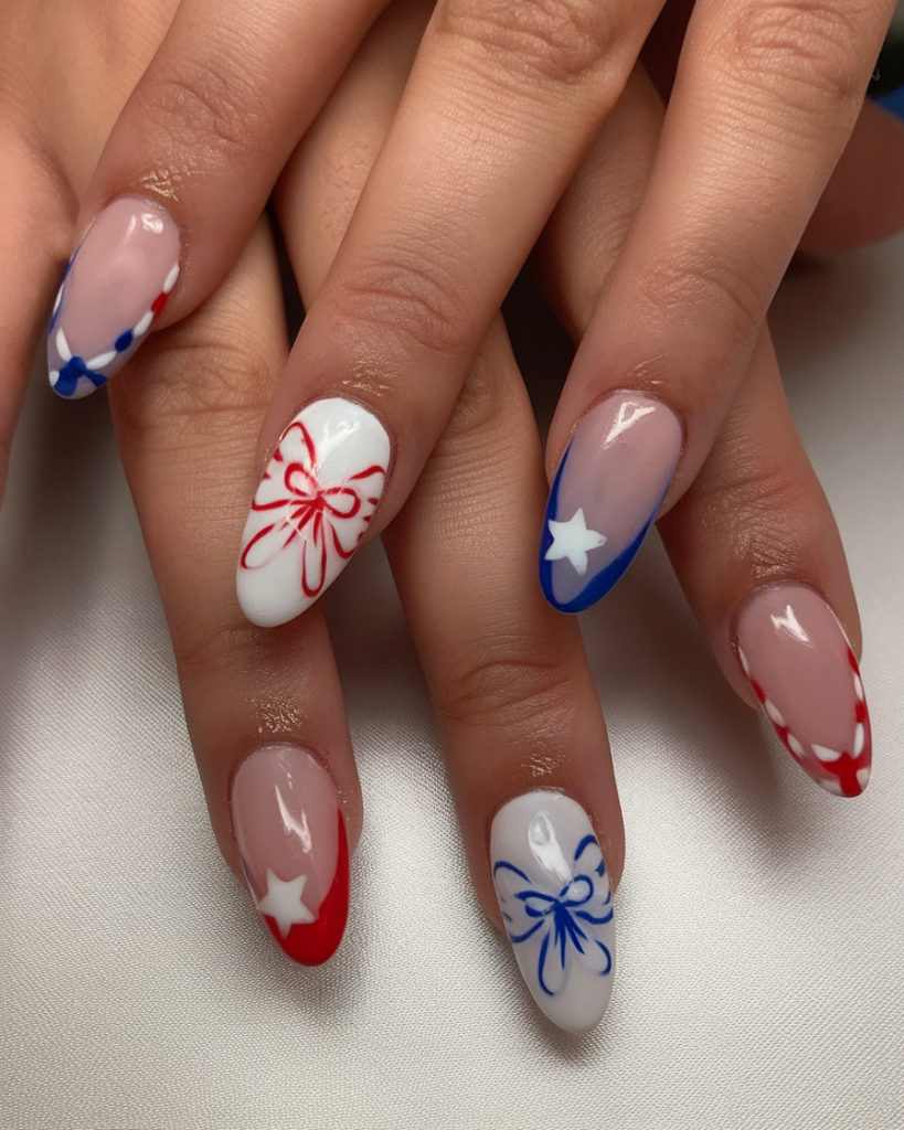 If you love vintage flair, this oval design is right up your alley. Red and blue bows, dotted stars, and minimalist french tip accents come together to create a playful, girly twist on the classic patriotic theme. It’s soft, sweet, and perfect for those who want to keep their nails festive without going over the top.