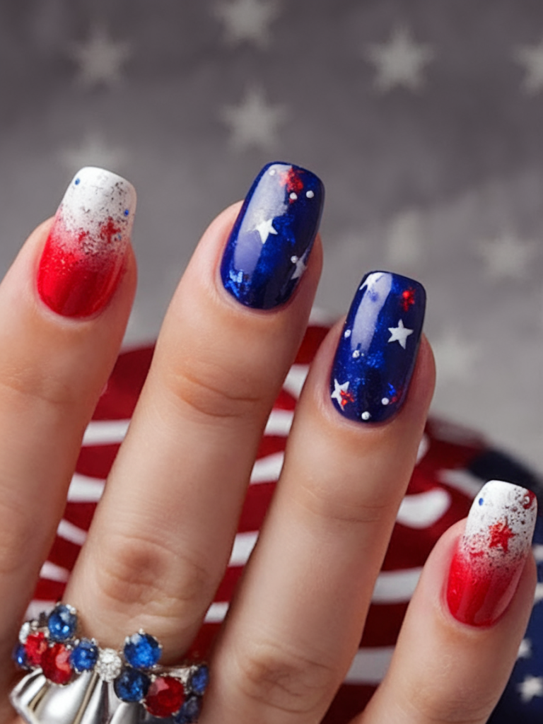 This short, square manicure strikes a balance between subtle shimmer and patriotic pride. A standout blue accent nail is adorned with delicate white stars, while the rest of the nails shine in gradient red glitters. It’s a design simple enough for everyday wear, yet festive enough to be holiday-ready. Perfect for busy women who want a low-maintenance look with maximum impact.