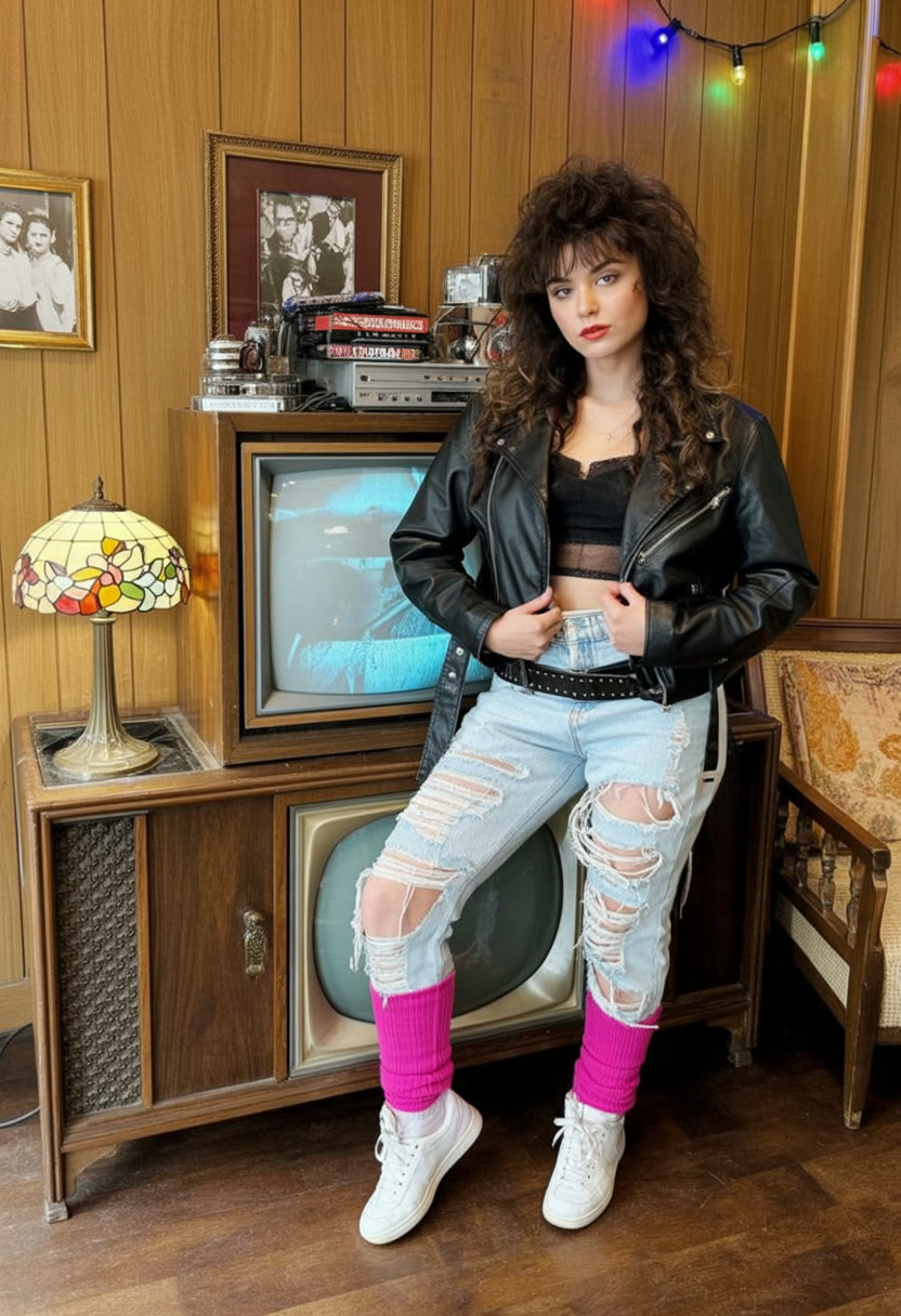 At first glance this is a pure rock chick: a black leather jacket, shredded jeans, and a lacy black crop that means business. Then you notice the hot pink leg warmers hugging white sneakers, and suddenly it’s like your favorite 80s workout video crashed a 90s dive bar. The mix is unexpected and completely addictive, the kind of outfit that turns a regular house party into a full-on dance floor. It’s bold, a little messy, and absolutely packed with Inspo if you’re craving a style shake-up.