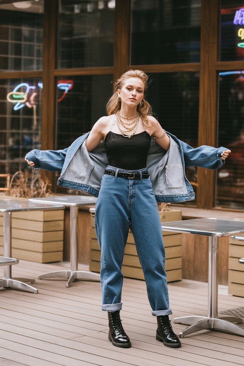 This look is pure 90s attitude with a 2026 twist: high-rise tapered jeans, a sleek black camisole, and a slouchy denim jacket thrown over the shoulders like you just walked out of a music video. The stacked gold chains and hoops keep it a little fancy without losing that laid-back edge, and the lace-up boots ground everything with just enough toughness. It’s the kind of outfit you wear when you want to feel like the main character on a Sunday coffee run or headed to casual birthday drinks, equal parts chill and in control.