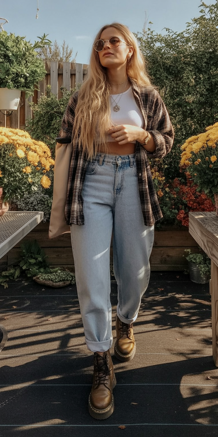 This outfit feels like autumn sunshine in clothing form: soft plaid flannel, a cropped white top, roomy mom jeans, and sturdy boots ready for whatever the day throws at you. There’s an easy, lived-in charm to it, like you just stepped out for a backyard tea party that might turn into a bonfire later. The mix of earthy tones and relaxed denim brings that 90s nostalgia into 2026 without feeling like a costume, perfect for a slow Sunday wandering the farmer’s market.