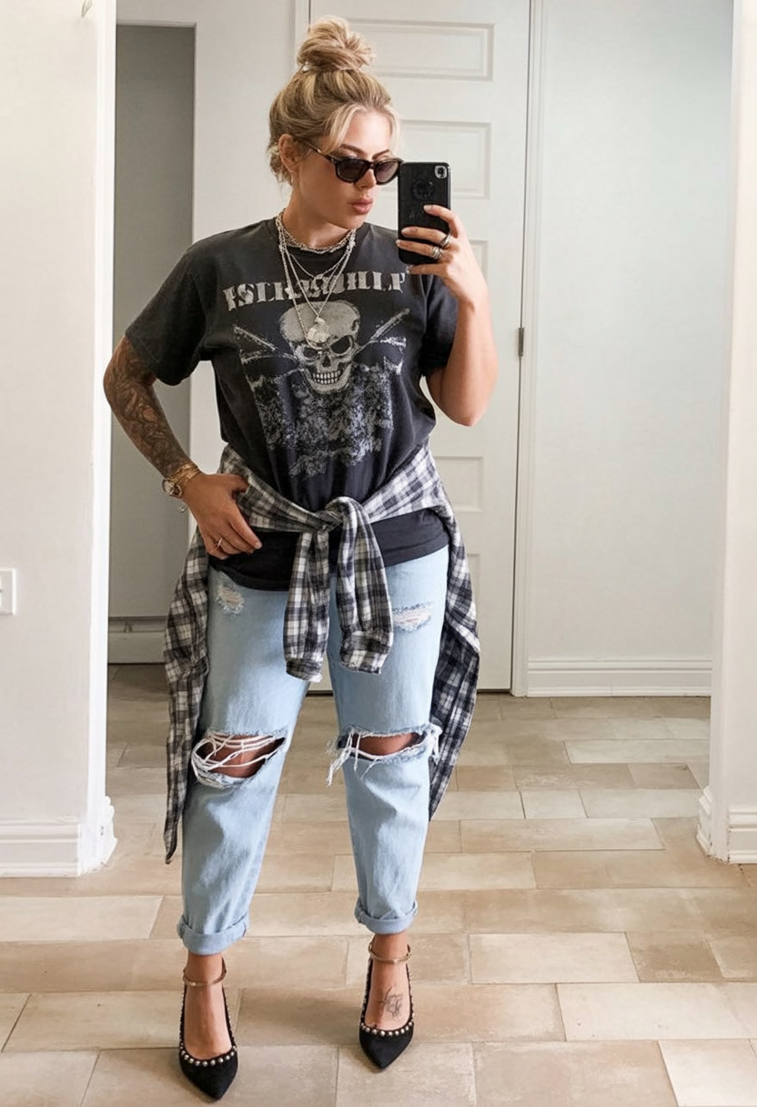 There’s a delicious contrast happening here: a shredded skull tee and ripped boyfriend jeans topped with a plaid shirt slung around the hips, then finished with sharp studded heels. It feels like you got dressed for a rock show and then remembered you also run the meeting. The messy bun, layered chains, and dark sunglasses give full Baddie energy, but it still reads approachable enough for a Sunday coffee run. This is 90s grunge cleaned up just enough for 2026, equal parts rebellious and grown.