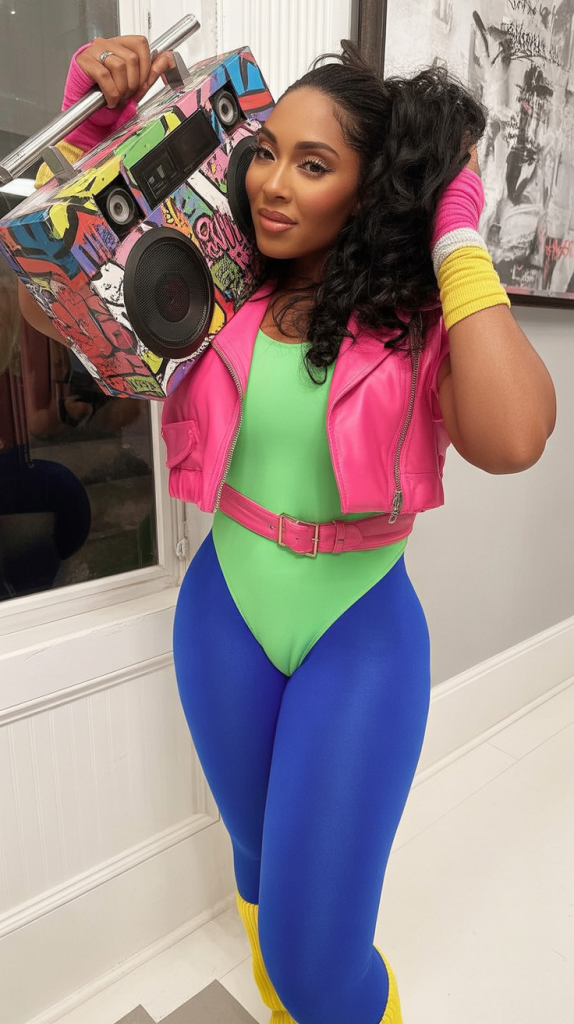 This look is unapologetically extra: a lime green bodysuit, electric blue leggings, a hot pink cropped vest, and sunshine-yellow leg warmers and wristbands, all topped off with a graffiti boombox. It’s like every 90s workout tape and birthday party memory wrapped into one outfit. The colors are loud, the silhouette is sculpted, and the whole thing radiates “life of the party” energy. Perfect for costume nights, themed Christmas events, or just that one friend’s drag show where subtlety is not on the guest list.