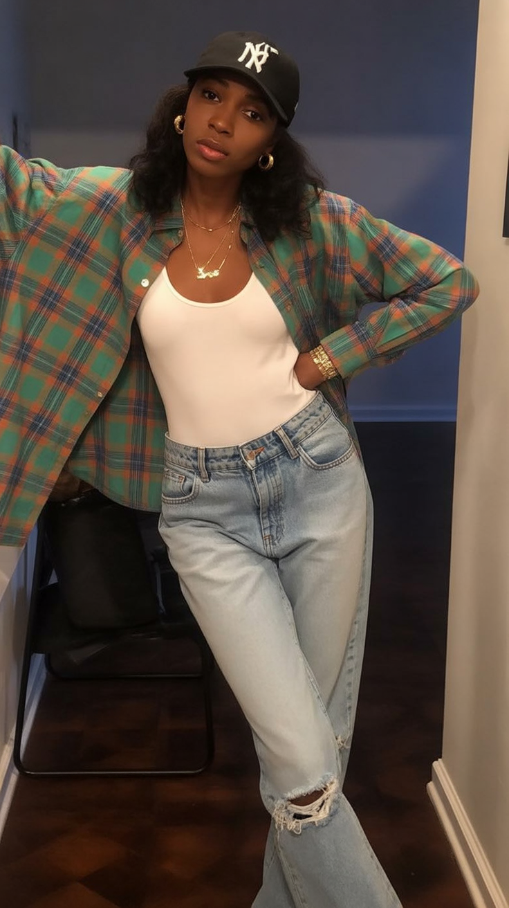 This look is for the woman who loves a little sporty spice in her closet: a crisp white bodysuit, soft-wash jeans, an oversized plaid shirt, and a cap that instantly pulls the whole story together. It feels like 90s college campus energy upgraded for grown-woman life, the kind of thing Black women throw on for last-minute brunch or a quick Target run and still look impossibly put together. Gold hoops and layered necklaces add just enough shine so you’re weekend casual, not gym-bound.