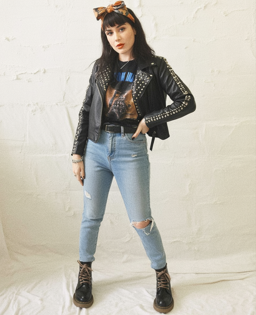 Here’s your inner 90s rock star, fully awake: a studded leather jacket, vintage tee, ripped skinny jeans, and tough boots that look ready for a mosh pit but walk just fine into a 2026 wine bar. The hair scarf and red lip soften the edge just enough to keep things classy instead of costume-like. It’s the outfit you reach for when you’re tired of being “put together” and just want to feel like the lead singer of your own life again.