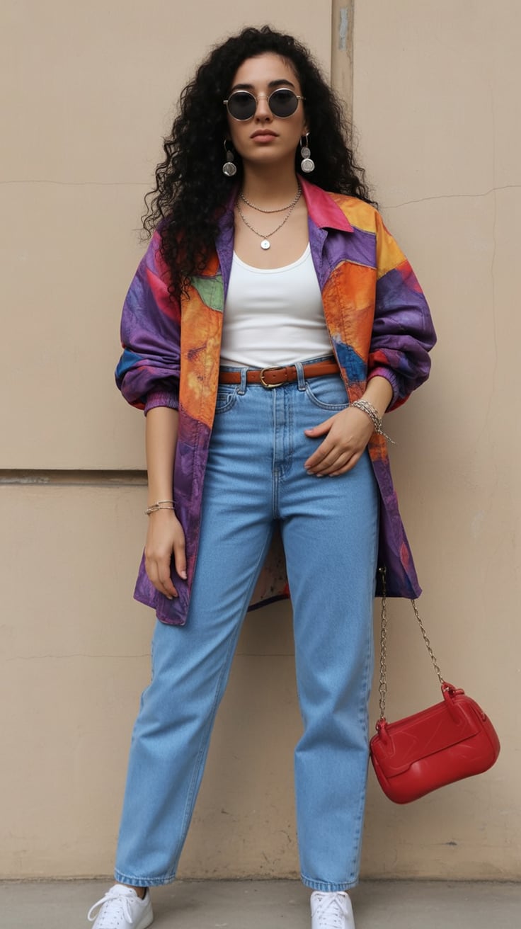 This outfit is a love letter to dramatic 90s color: a bold printed jacket, crisp white tank, light blue jeans, and a bright red bag that refuses to whisper in the corner. The whole look feels like a walking mood board, the kind of thing you wear when you’re ready to be seen but still want the comfort of your favorite denim. Big curls, round sunglasses, and playful earrings make it feel a little dressy, a little artsy, and totally at home in 2026 city streets.