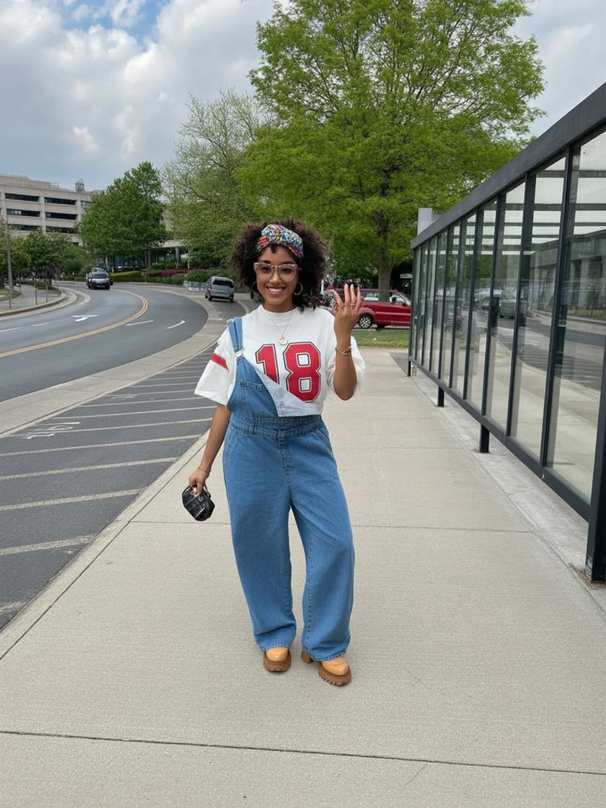 There’s a joyful, almost childlike spirit in this 90s-inspired overall moment, and that’s exactly why it works so beautifully in 2026. The slouchy denim, sporty tee with bold numbers, bright headband, and chunky clogs come together like a grown-up version of your favorite playground outfit. It’s playful without being childish, cute without trying too hard, and feels perfect for a Sunday stroll, a casual birthday hang, or even a quick road trip stop for ice cream.