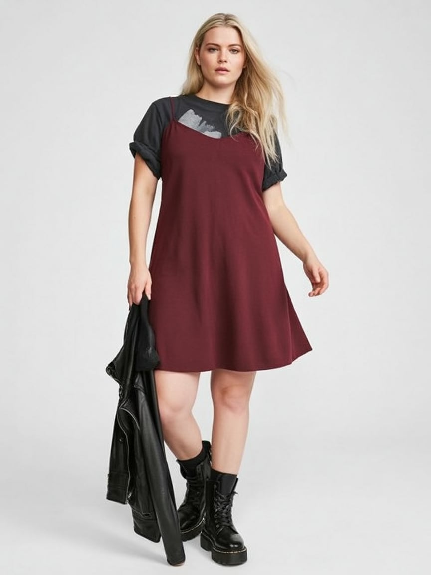 This outfit is the spiritual granddaughter of every 90s girl who layered a slip dress over a band tee and called it a day. The deep wine dress reads a little dressy, but the graphic t-shirt underneath and chunky boots pull it right back into cool-girl casual. It’s the kind of thing you could wear to a Sunday market and then straight to a concert, still feeling cute and comfortably yourself. That leather jacket in hand is just waiting for a breezy night or a surprise rainy evening.