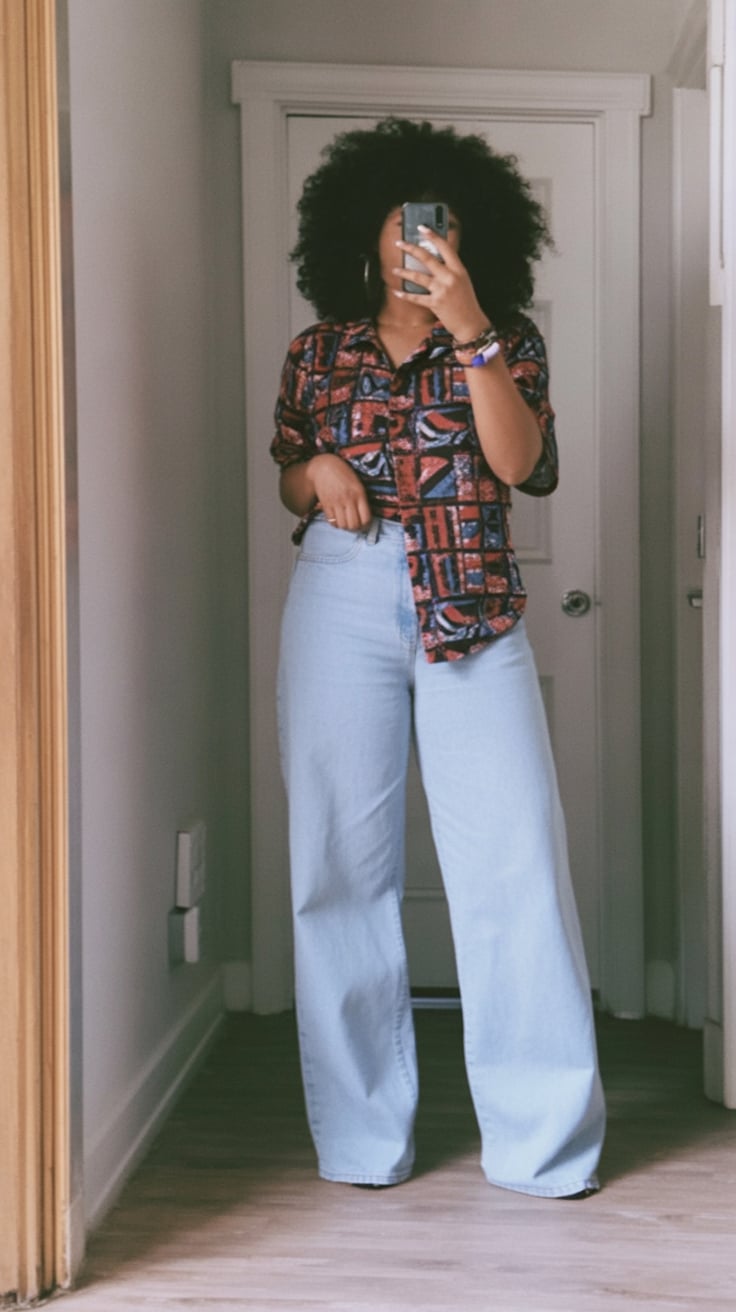 There’s something quietly powerful about this look: an artsy patterned shirt half-tucked into pale wide-leg jeans, worn with the confidence of someone who knows her style isn’t up for debate. The relaxed silhouette feels like 90s coffeehouse cool updated for 2026, perfect for a cozy Sunday that somehow turns into spontaneous brunch looks with friends. On Black women, those soft denim tones and warm prints really pop, bringing out natural texture and glow without trying too hard.
