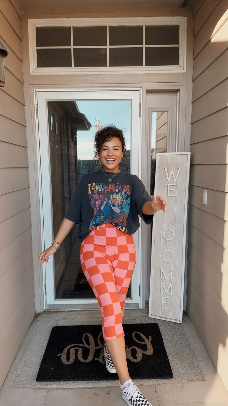 This look is pure 90s fun dialed up for 2026: bold checkered leggings, an oversized band tee casually knotted at the waist, and classic checkerboard sneakers tying it all together. It’s the outfit you throw on when you want your clothes to match your mood—bright, energetic, and maybe just a little chaotic in the best way. The mix of prints feels like an instant mood boost, perfect for a casual Sunday at home that turns into an impromptu hang with friends.