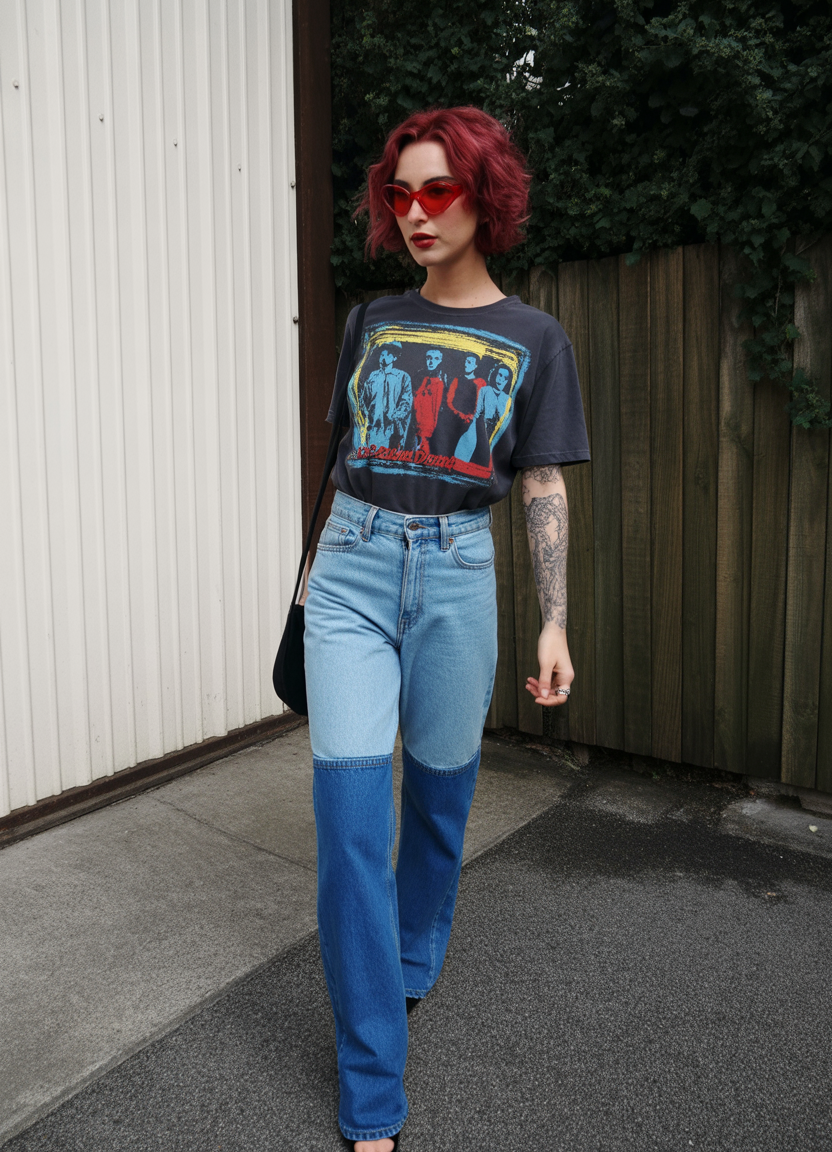 Walking down the street in two-tone patchwork jeans and a graphic band tee, this look feels like a 90s concert flyer come to life. The vivid red bob and matching sunglasses add just the right hit of baddie drama, while the relaxed tuck of the shirt keeps everything from feeling overstyled. It’s the kind of outfit you wear for casual fall afternoons, record-store browsing, or just a solo city walk where you’re your own best company. Simple pieces, big attitude.