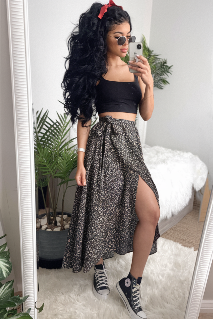 With the multifaceted style, this outfit seems to be both retro and beyond. A cropped black tank and a high-slit floral wrap skirt which is a summer outfit pairing that gives off the vibe of casual and sexy. The choice of high-top Converse sneakers that add a bit of aesthetic grunge to the whole outfit further the playful yet laid-back feel. A small hair accessory, like a bow or bandana, further enhances the 90s appeal.