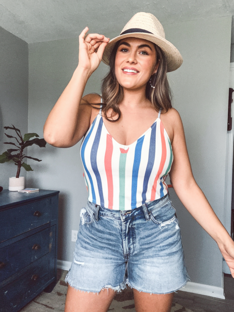 A colorful striped tank top and a distressed denim shorts combo is the super cute and casual choice. The length of the vertical stripes on the dress is the main point, and that is because the dress is a colorful dresser. The straw fedora that makes it look like a vacation hat gives a chill and perfect for going to the beach. This is the perfect outfit for a beach day.