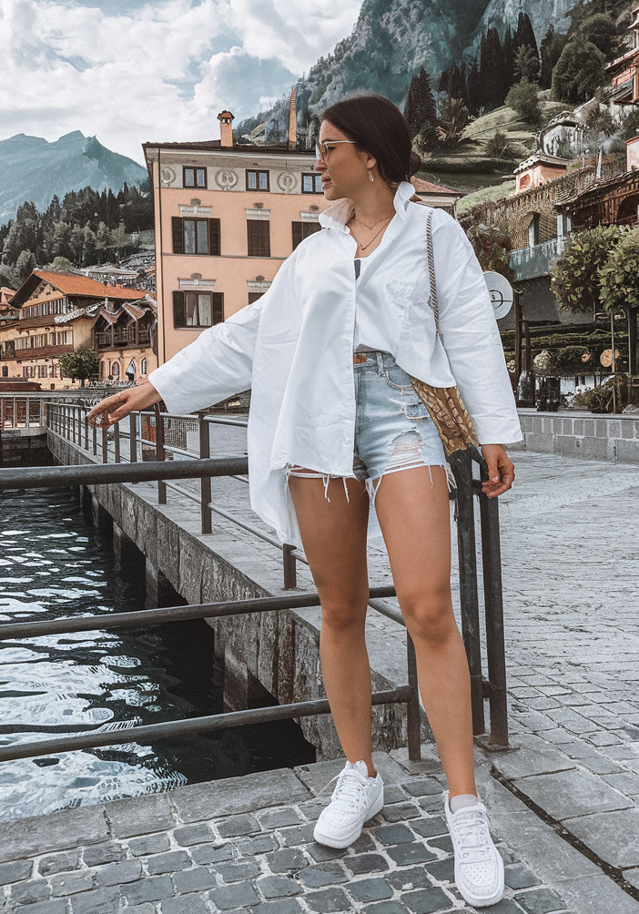 The summer vibes that this outfit is channelling are everything. It consists of a white button shirt that is oversize and a pair of high-waisted frayed denim shorts. The structured and light shirt gives it a little bit of aesthetic vintage, whereas the crisp white sneakers are just casual and comfortable.