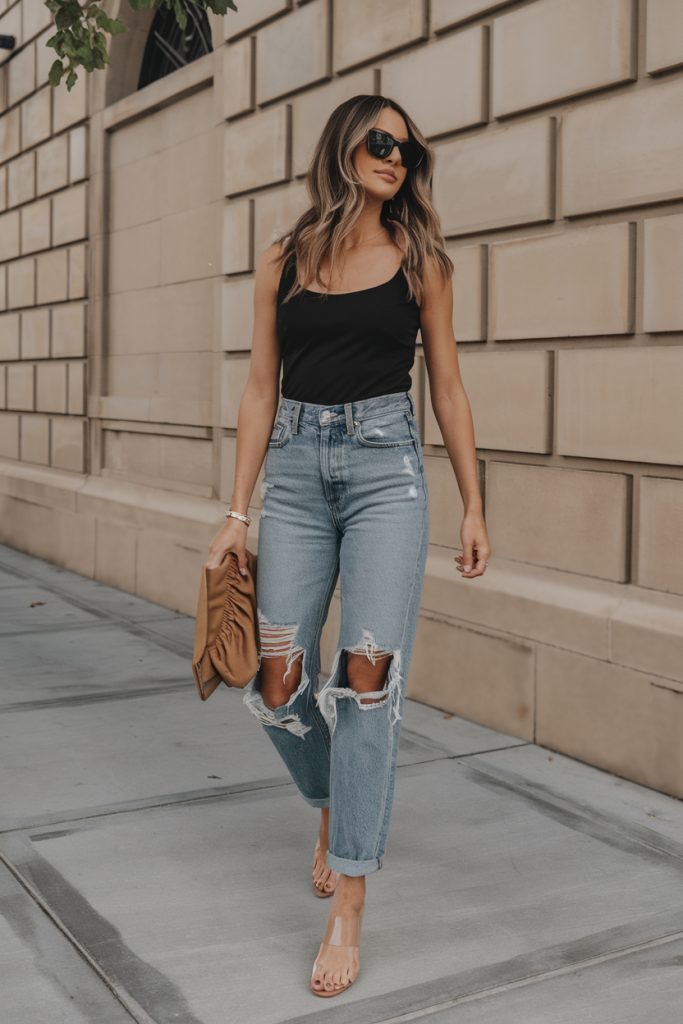 This casual but laid-back outfit is Cool&Street Approved.The design of a black fitted tank top perfectly combines with the high-waisted heavily distressed jeans which is creating the casual yet, the strongest 90s look. The combination of the transparent-heeled sandals with the outfit gives a modern touch which makes this look ideal for casual but stylish everyday appearance.