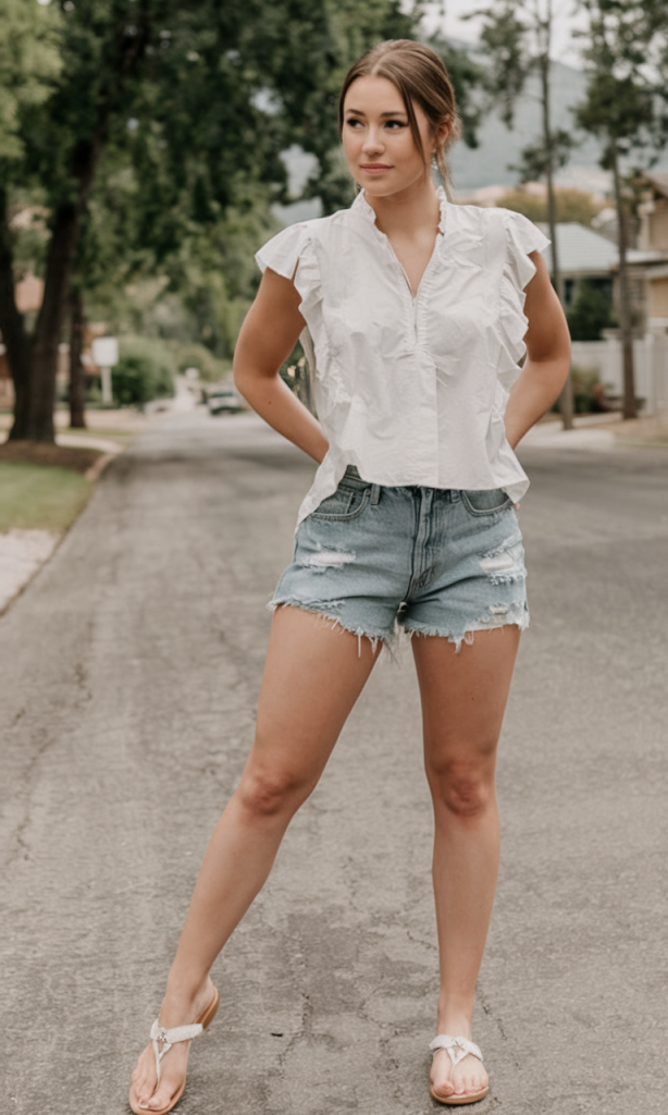 If aesthetic vintage is what you are looking for, it does not come better than distressed denim and feminine ruffles. This look showcases a relaxed style of the 90s with a white ruffle blouse that is accompanied by the high-waisted, distressed denim shorts. The cute contrast between structured and casual components makes the outfit ideal for wearing daily. Whether you are out for errands or you spend time with friends for coffee, this is undoubtedly the first casual outfit for your summer of 2025.
