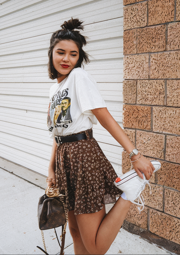 A vintage band tee tucked in a light, printed mini skirt is like a loud cry for 90s inspiration. This outfit is the perfect combination of casual streetwear and flirty style, which is why you can wear it every day. The black leather belt which is a structured element expresses that, while the white sneakers that go with the outfit keep it cool and casual.