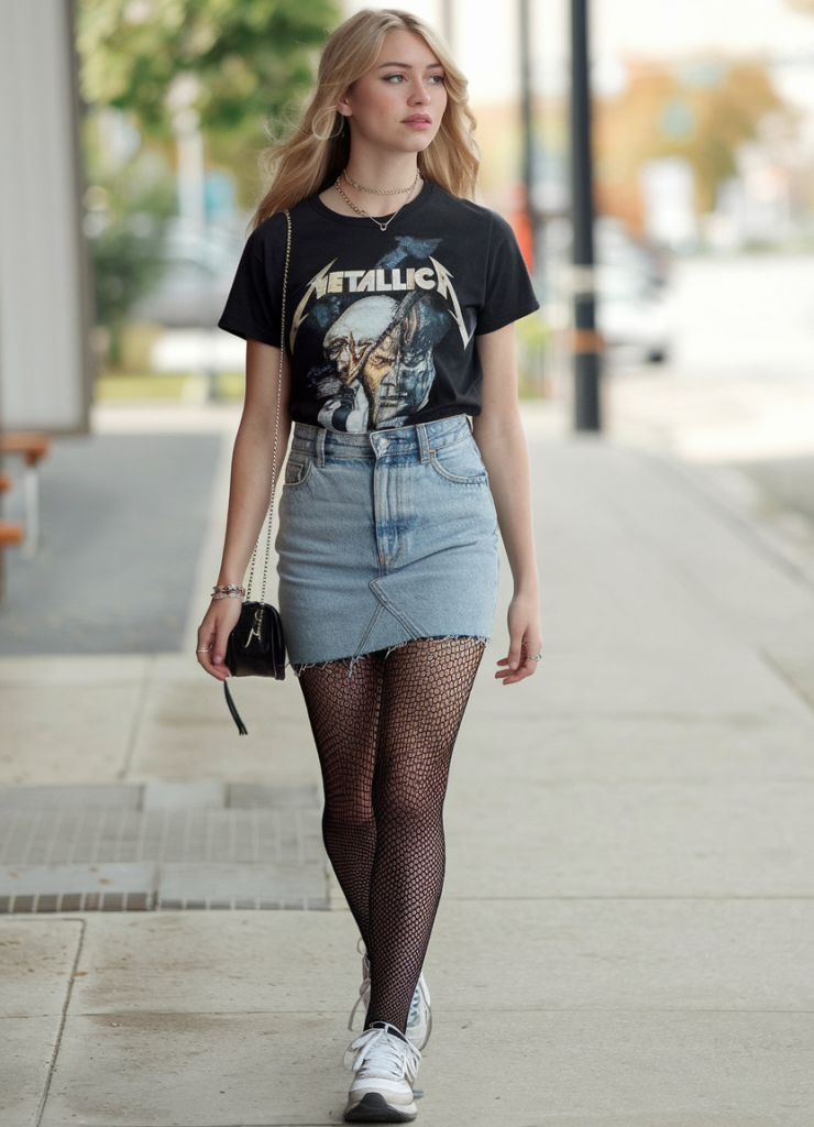 This is a vision of the old good grunge style with a modern twist, where a Metallica graphic tee worn in the conservative manner is paired with a skirt made from the destroyed denim material. Fishnet tights, the flag-bearer of the 90s fashion trends, have taken the outfit to a whole new level of rebelliousness. The sneakers that are chunky in size are the perfect crossover to a sporty style.