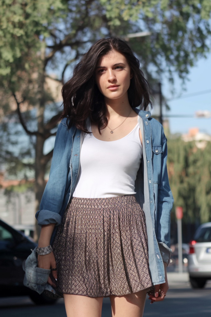 Feminine and Relaxed in a Flowy Skirt and Denim Shirt
