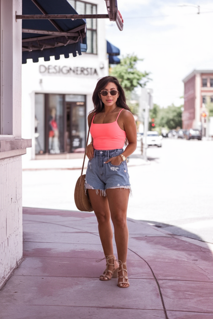 Adopting the audacious spirit of the 90s, this ensemble features an eye-catching cropped tank and is notably combined with frayed denim cutoffs giving a lively summer look. The neon colored tank top is a perfect example of the contemporary idea mixed with an old-fashioned / vintage / retro paradigm, for those who are into experiencing and wearing distinctive items.
