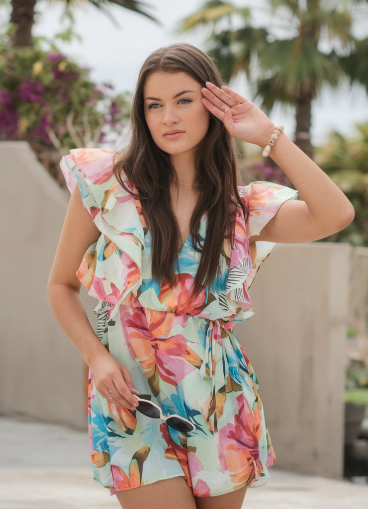 A floral romper as an alternative to traditional summer dresses shows the perfect combination of aesthetic dress and effortless fashion. This item is both flattering and trendy because of its plunging neckline and structured waist, while metallic accessories are extra glam.