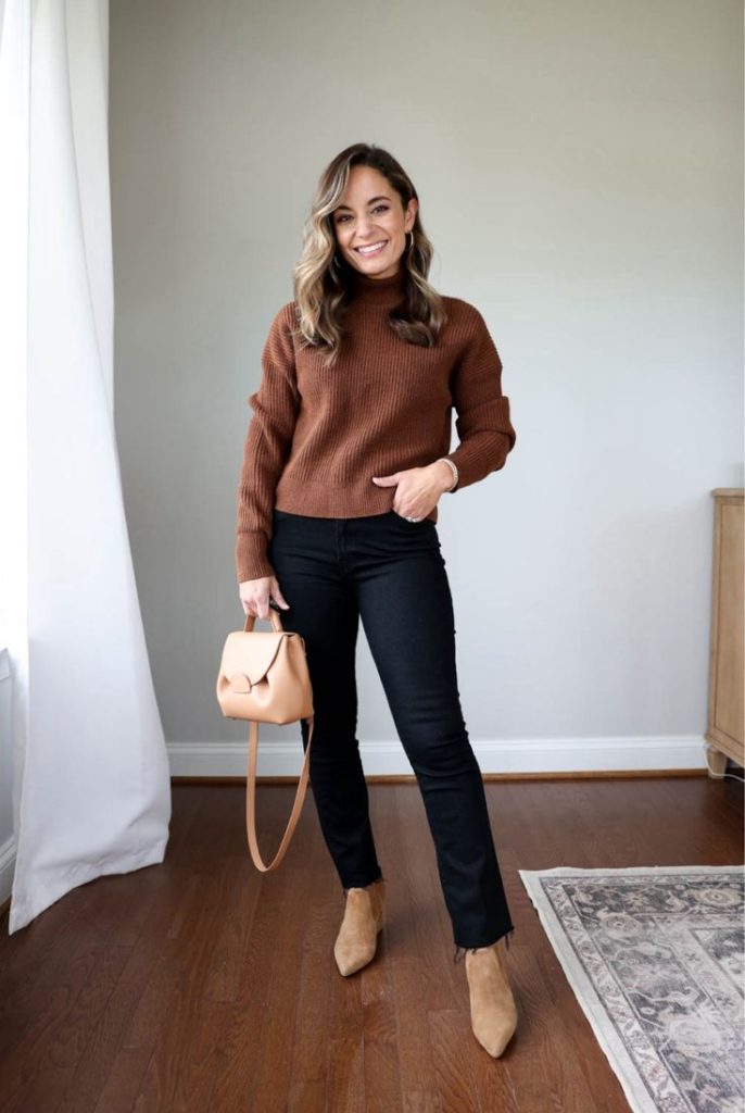 Brown hues dominate fall fashion, and this brown knit sweater paired with black jeans is a cozy yet casual classy choice. The tan suede ankle boots add a subtle Western charm. Ideal for weekend brunches or casual office settings, this outfit exudes effortless elegance.