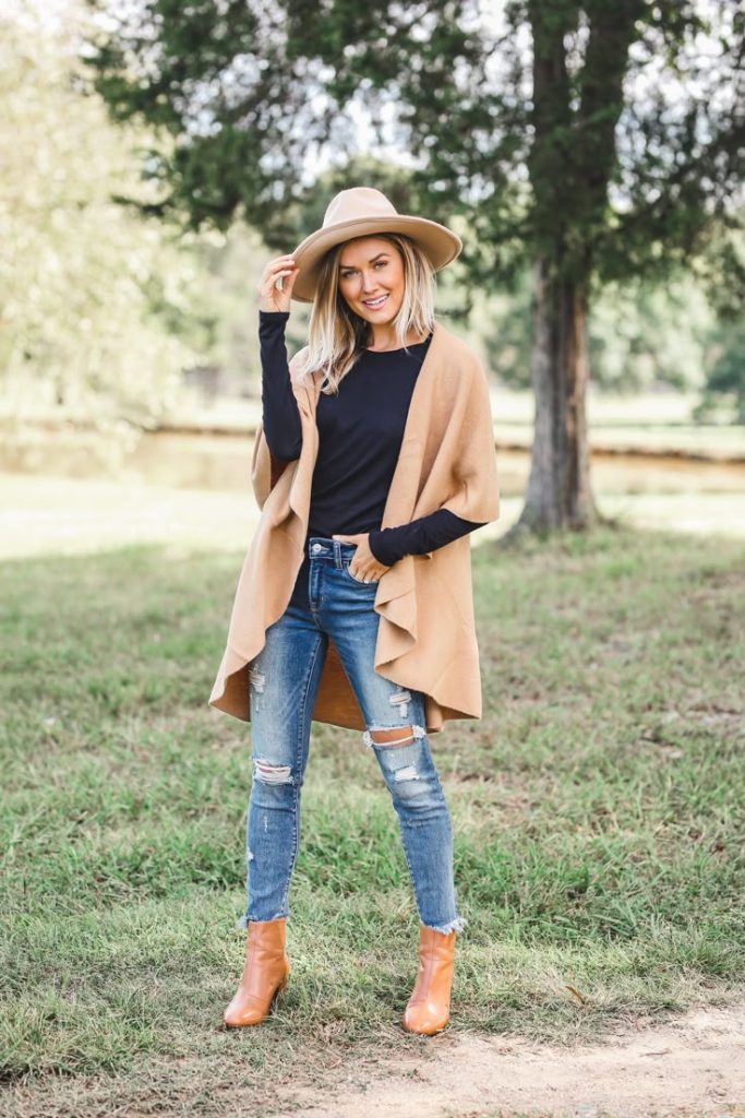 For a seasonal outdoor look, this outfit combines a long camel cape over a black fitted top and distressed denim jeans. The brown heeled ankle boots bring a Western feel, while the wide-brim hat adds an extra touch of flair. A great choice for fall adventures and casual meet-ups.