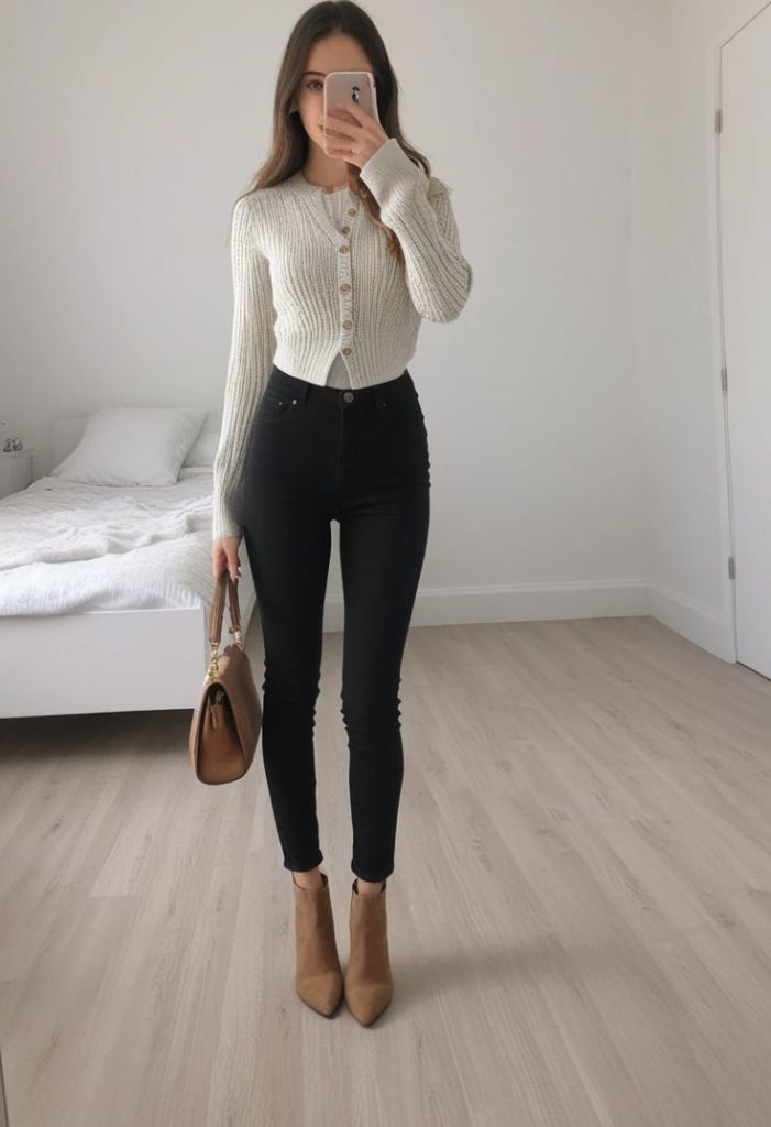 A chic white cropped cardigan paired with black high-waisted jeans and tan suede ankle boots proves that simplicity is key. This work chic outfit is effortlessly stylish, offering a clean, refined silhouette that transitions easily from day to night.