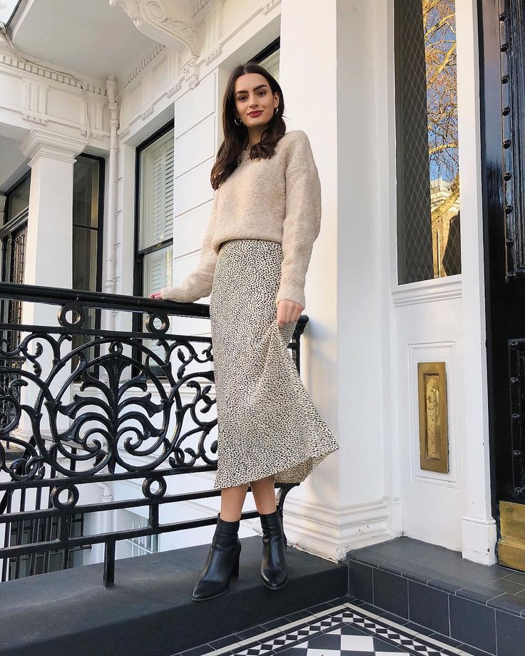 For a formal yet modern touch, a beige fuzzy sweater paired with a leopard-print midi skirt and black heeled ankle boots creates a refined yet trendy ensemble. Ideal for party nights or professional gatherings, this outfit balances texture and pattern beautifully.