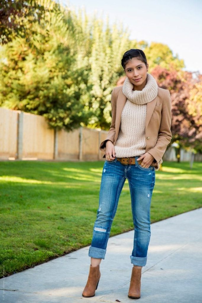 This outfit embraces fall layering with a chunky knit turtleneck sweater under a camel blazer, paired with distressed blue jeans. The brown suede ankle boots add a Western touch, making this a go-to choice for casual winter days or relaxed weekends.